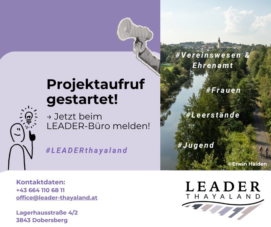 Die LEADER-Region Thayaland startet einen themenoffenen LEADER-Förderaufruf zur Unterstützung innovativer und kooperativer Projekte. Insgesamt stehen 400.000 € zur Verfügung, um Vereine, Gemeinden und Privatpersonen bei der Umsetzung ihrer Ideen zu fördern.