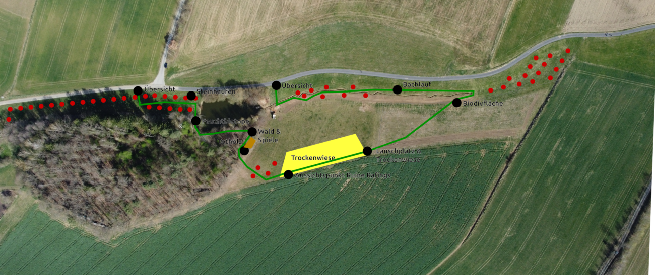 Auf rund 2,5 Hektar Naturerlebnisfläche in Rafings entsteht deshalb ein vielfältiger Lern- und Erlebnisraum für junge Menschen. Neue Obst- und Nussbäume, Steinhaufen, Totholzinseln, eine Trockenwiese sowie ein wieder geöffneter Bachlauf mit Feuchtbiotopen schaffen wertvolle Lebensräume für Tiere und Pflanzen.